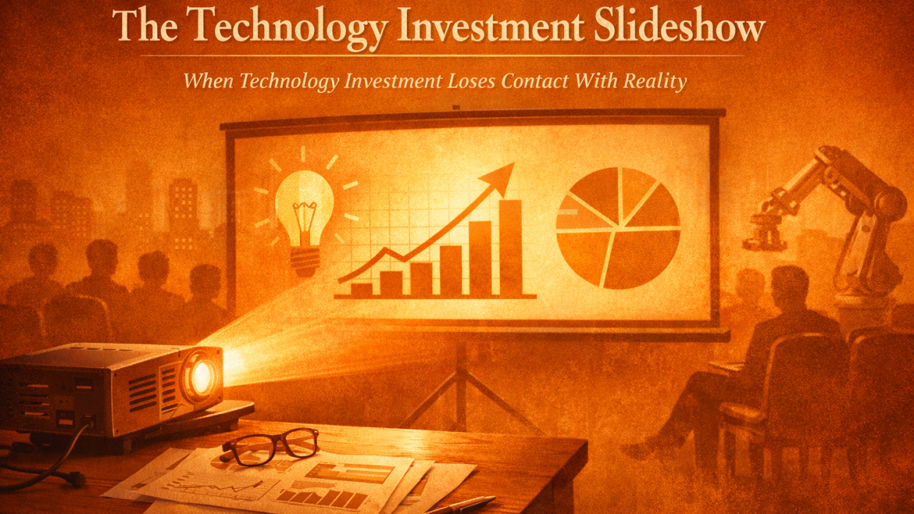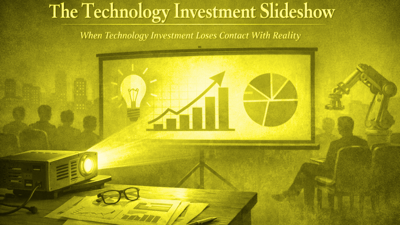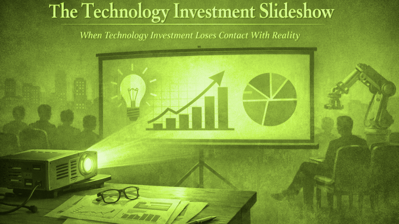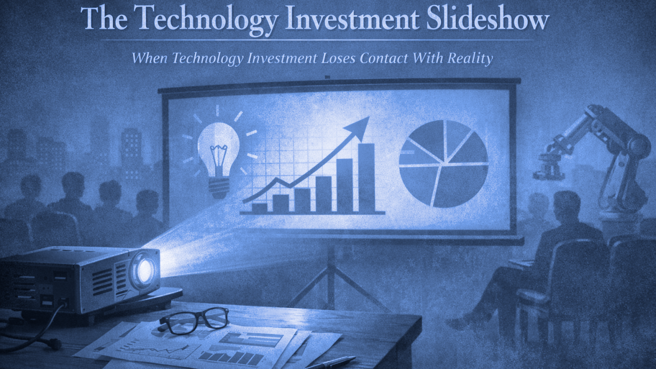 The Technology Investment Slideshow 20 January 2026 Technology investments can look flawless in slides yet fail in reality. Learn why technical depth matters more than polished presentations when evaluating innovation. READ MORE